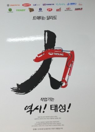 태성공업 입구에 있는 포스터 인데요, 주 생산품인 포크레인을 힘력자와 적절히 활용한 포스터입니다.